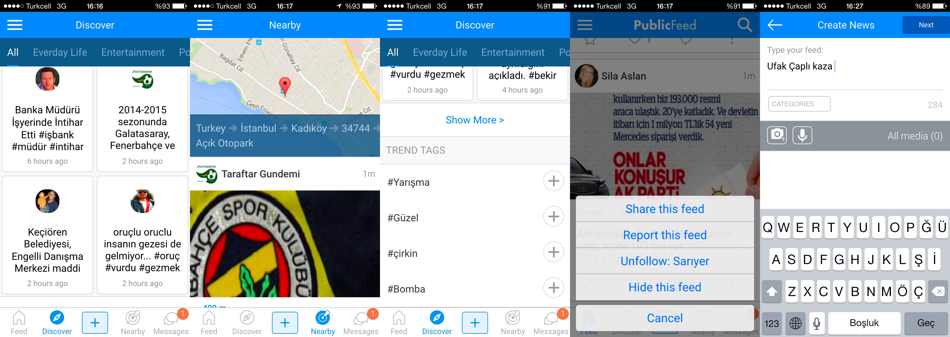 PublicFeed, yayıncı ve izleyici arasındaki sınırı tamamen ortadan kaldıran, konum tabanlı bir haber uygulaması. Her kullanıcının etrafında olan biteni kısa yoldan haberleştirmesini sağlayan uygulama, ilk etapta ABD’de yayınlandı. Türkiye’de geliştirilen PublicFeed, kısa bir süre önce de Türkiye’ye açıldı.