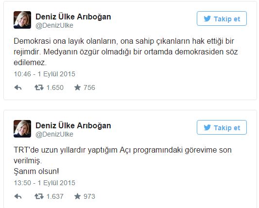İstanbul Üniversitesi ve İstanbul Bilgi Üniversitesi öğretim üyesi Deniz Ülke Arıboğan, bugün sabah saatlerinde İpek-Koza Grubu’na ve ona bağlı medya kuruluşlarına yapılan polis baskınlarına Twitter’dan tepki gösterdi. “Demokrasi ona layık olanların, ona sahip çıkanların hak ettiği bir rejimdir. Medyanın özgür olmadığı bir ortamda demokrasiden söz edilemez” yazan Arıboğan, bundan yaklaşık üç saat sonra TRT’deki işine son verildiğini “Şanım olsun!” diyerek yine Twitter üzerinden duyurdu.