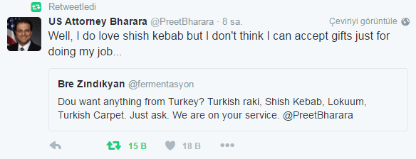 Bre Zındıkyan isimli kullanıcı “Türkiye’den istediğiniz bir şey var mı? Türk Rakısı, şiş kebap, lokum, Türk halısı. İstemeniz yeterli. Hizmetinizdeyiz.” diyerek Preet Bharara’yı mentionladı